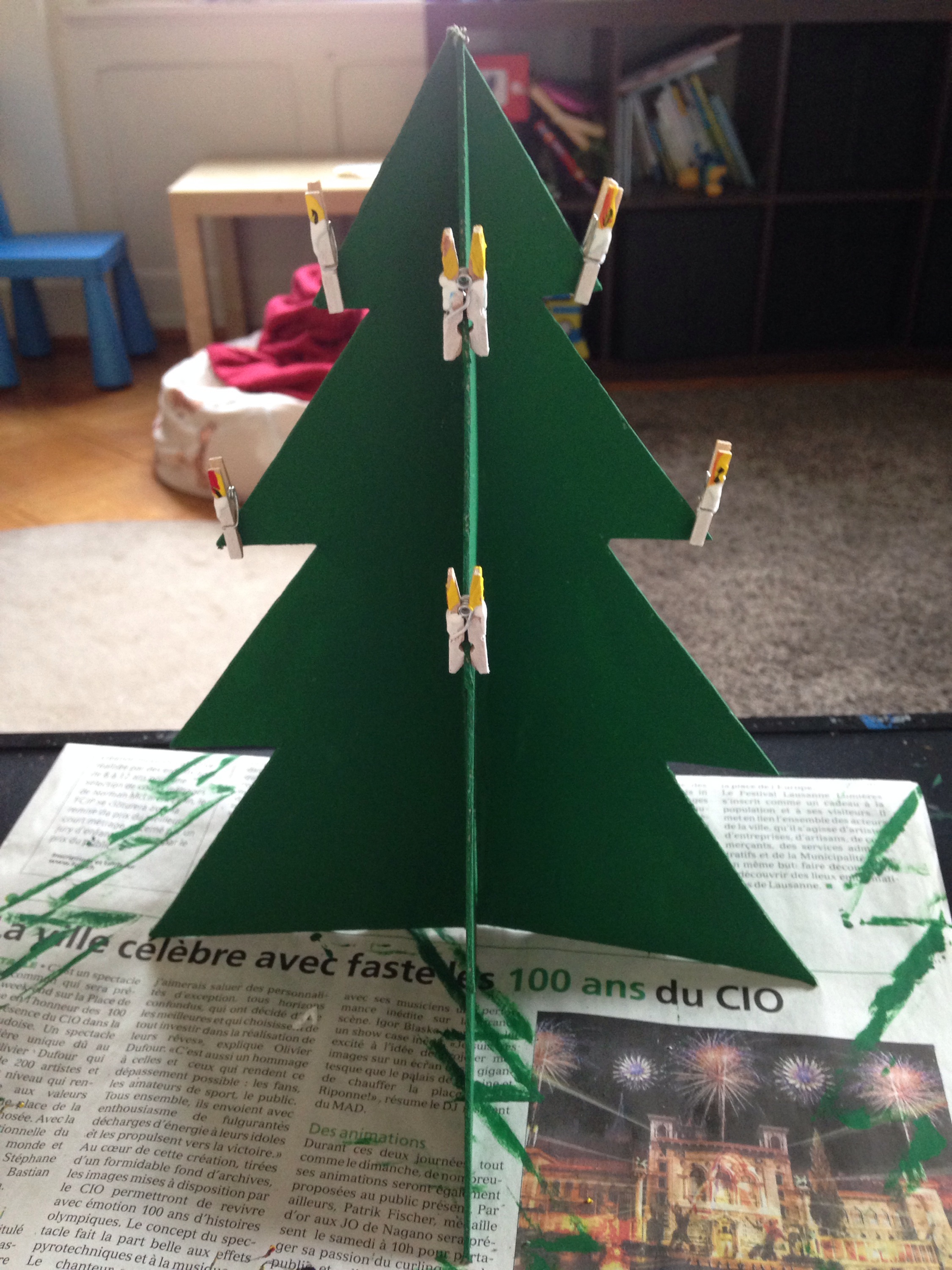 Erre jött az ötlet, mi lenne ha csinálnék kartonból egy ilyen kis fenyőt, kifesteném, és erre akasztgatnám a tojásokat. Az hogy pici csipeszek segítségével, már csak később jött és hogy a csipeszeket is kifestem, mintha kis gyertyák lennének, meg már csak az utolsó simitásoknál:)