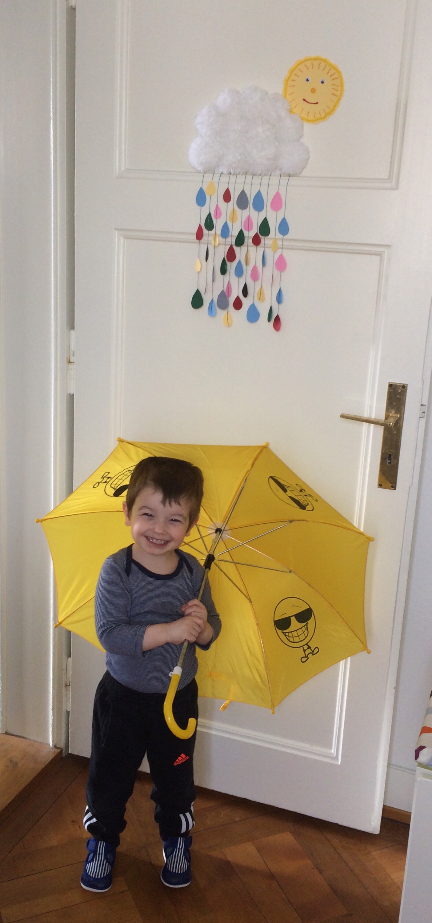 2. Kivágtunk színes papírokból esőcseppeket. A színeket Balázs választotta ki:).