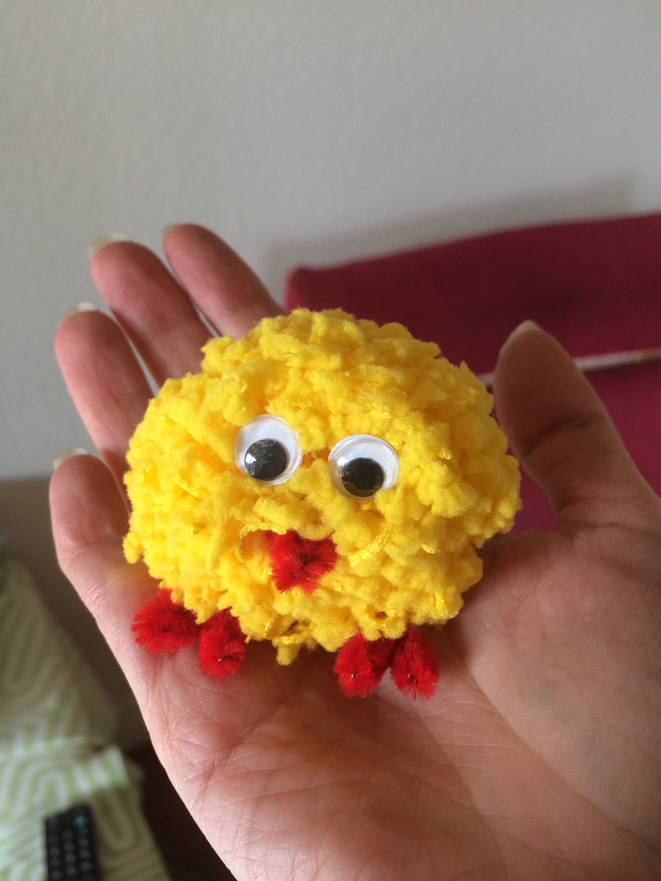 Csak készítettem egy pompomot, átdugtam a közepén egy piros zsenília drótot, az egyik végéből hajtottam a csőrét, a másikból a két lábát. Szemet ragasztottunk rá és kész is lett a csibe:).