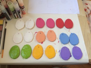 Szerencsére nem közvetlen Húsvét előtt kezdtük, így volt pár napja a végső száradásra. Először egyszínűekre festettük, majd kidíszítettük.