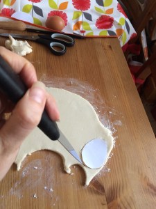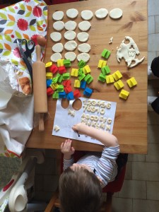2. Kivágtam papírból egy tojás formát, majd késsel körbevágva kiszaggattam a gyurmából. (Készültek betűk és számok is, mert Balázs ragaszkodott hozzá.)