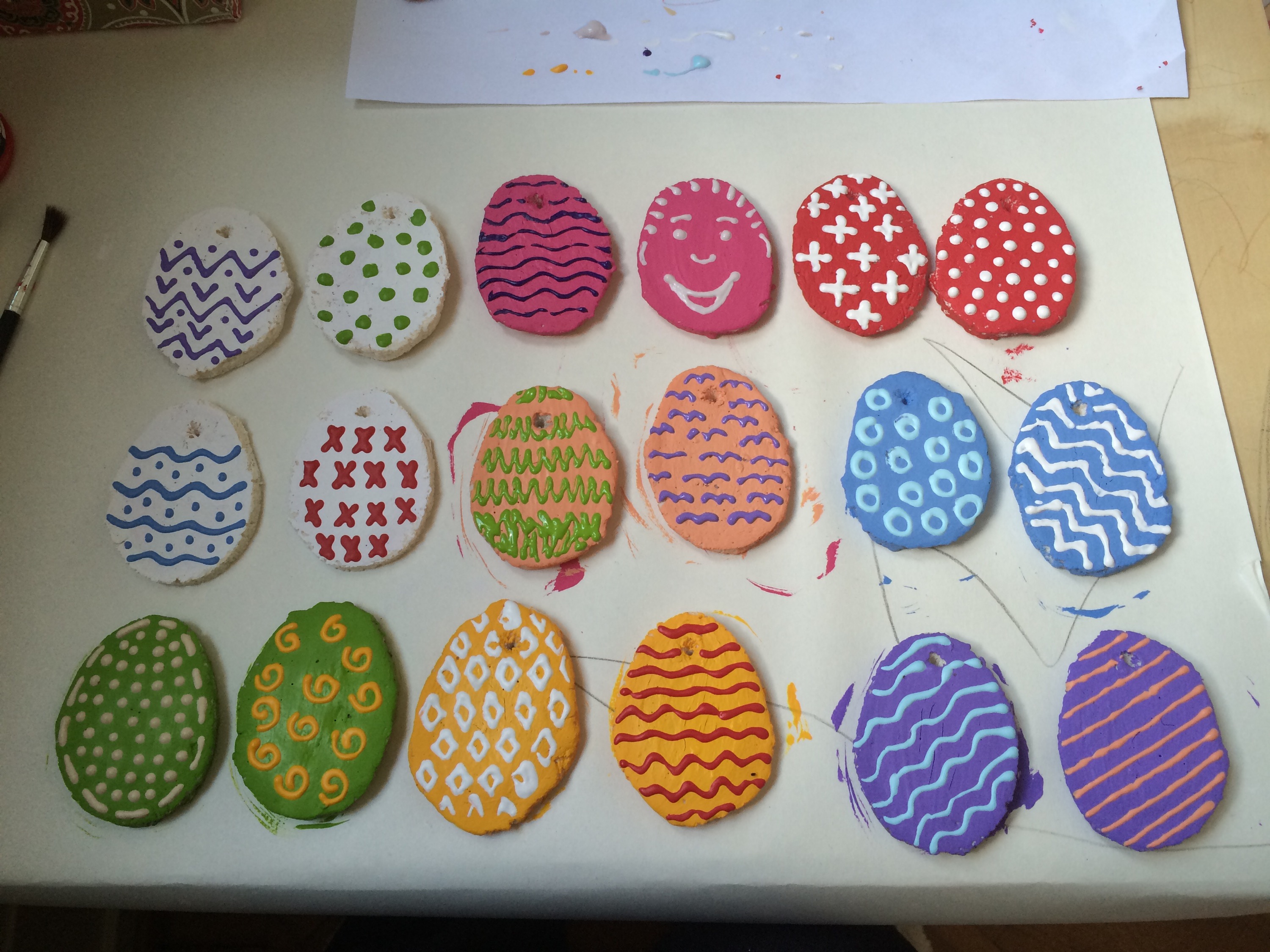 Szerencsére nem közvetlen Húsvét előtt kezdtük, így volt pár napja a végső száradásra. Először egyszínűekre festettük, majd kidíszítettük.