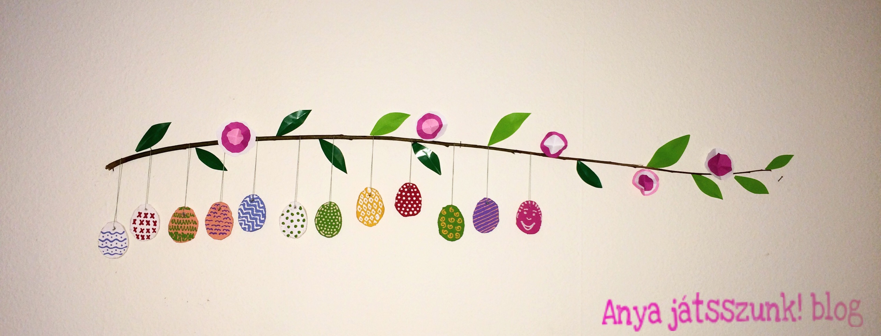 5. Kerestünk egy faágat – ez bizonyult a legnehezebb feladatnak, mert eredetileg egy szép szerteágazó ágra gondoltam, hogy majd azt beleállítjuk egy nagy vázába és az ágaira akasztgatjuk a tojásokat. Na, ez nem jött össze, nem találtunk ilyen szép ágat, fáról levágni meg nem akartam. Úgyhogy maradt egy ág, a falra tettem és mivel nagyon csupasznak tűnt, kicsit feldíszítettük. Papírból készítettünk leveleket és virágokat..