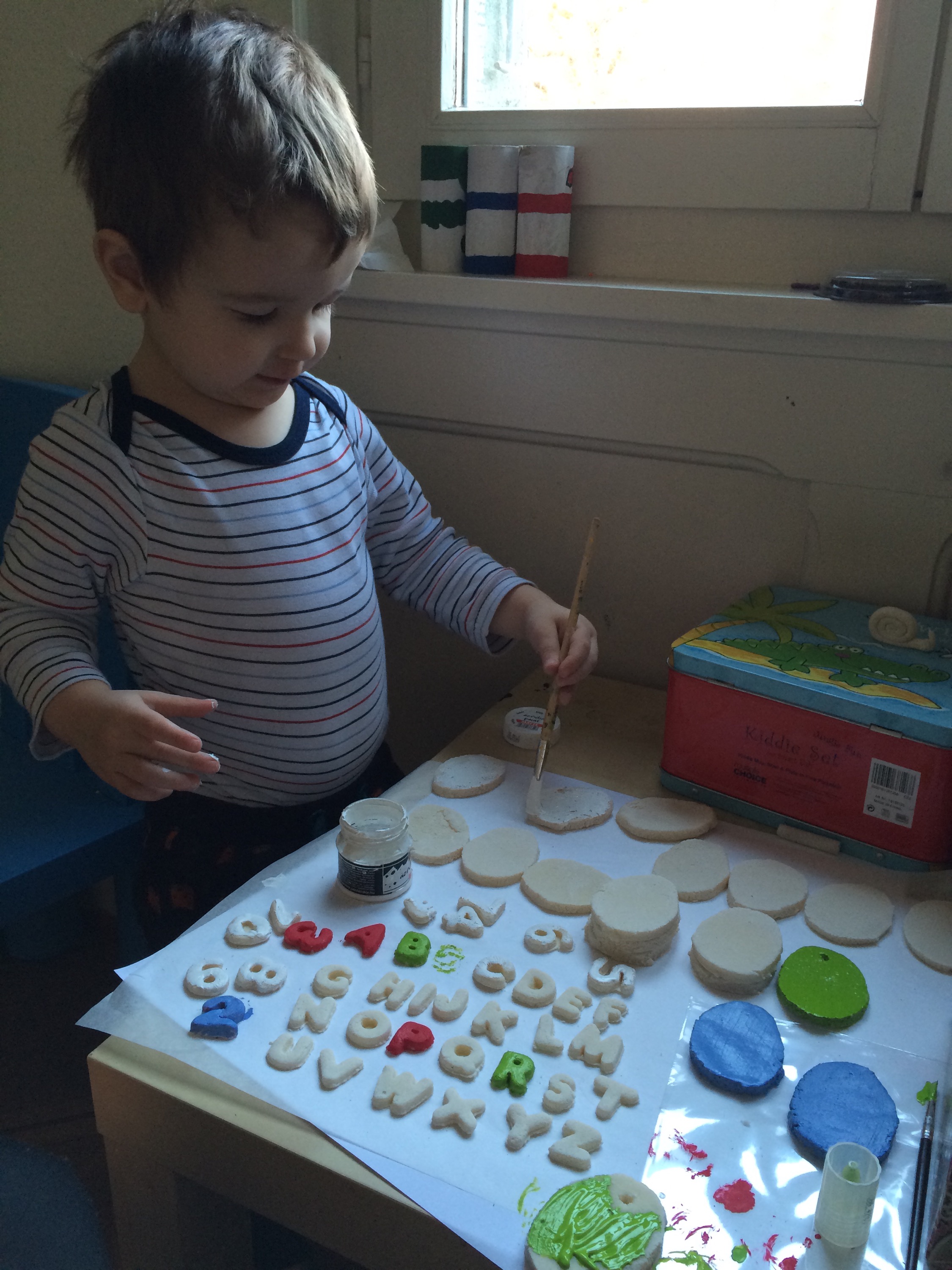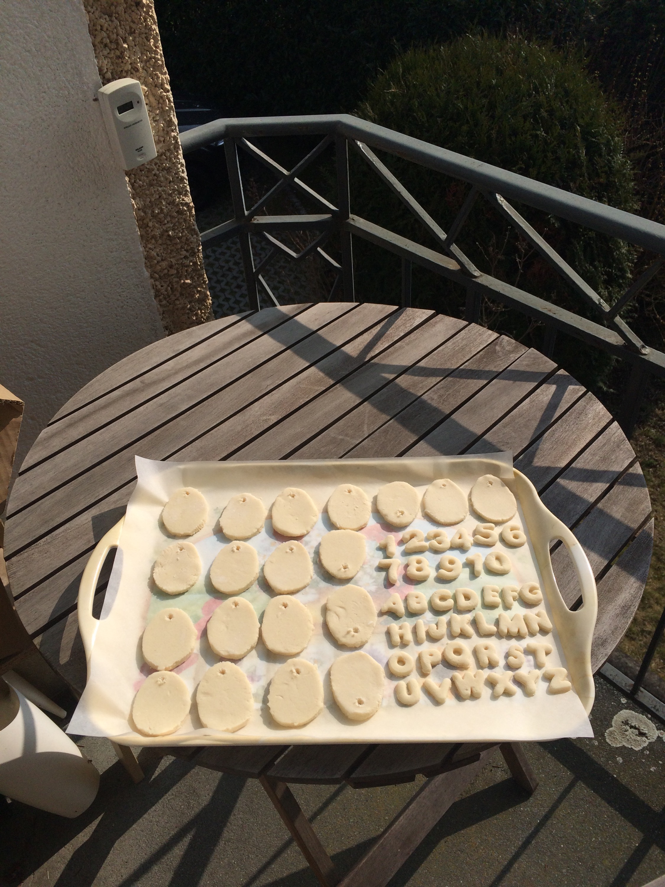 2. Kivágtam papírból egy tojás formát, majd késsel körbevágva kiszaggattam a gyurmából. (Készültek betűk és számok is, mert Balázs ragaszkodott hozzá.)