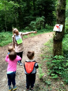 A program a következő volt: készítettek táblákat melyeken egy-egy állat képe és egy-egy gyerek fotója volt, amint épp imitálja, hogy mit csinál az állat. Mutatja, hogyan kell most tovább haladni a következő ‘állomásig’. Ezeket a táblákat valaki előre felkötötte a fákra egy meghatározott útvonalon. A feladat az volt, hogy táblától tábláig haladva érjünk végig ezen az úton, persze követve amit a táblán látunk, hol béka urgálással, hol őzike módjára, vagy mackósan… :D.