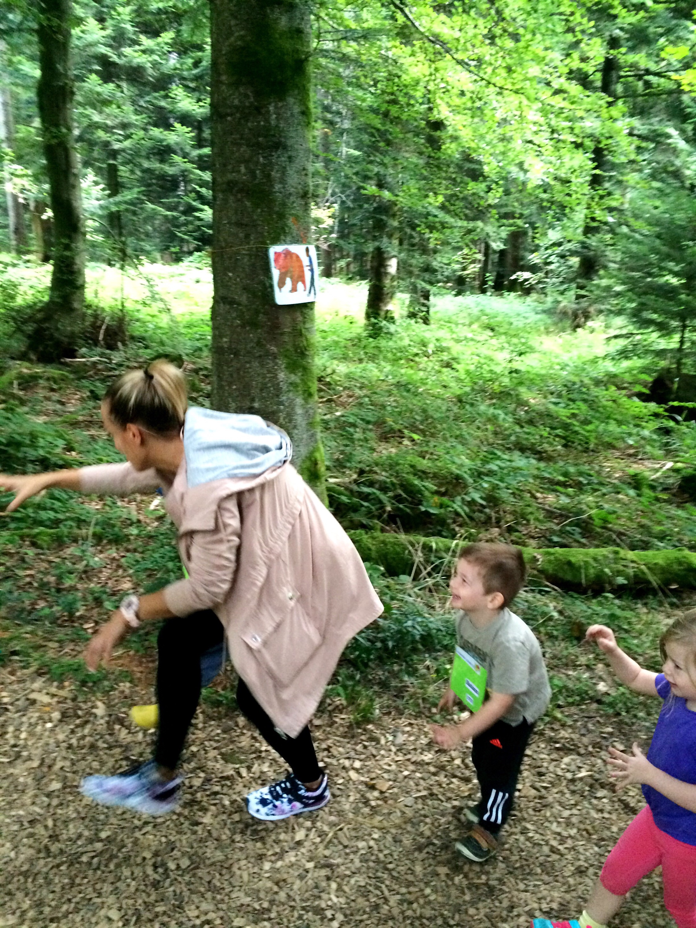 A program a következő volt: készítettek táblákat melyeken egy-egy állat képe és egy-egy gyerek fotója volt, amint épp imitálja, hogy mit csinál az állat. Mutatja, hogyan kell most tovább haladni a következő ‘állomásig’. Ezeket a táblákat valaki előre felkötötte a fákra egy meghatározott útvonalon. A feladat az volt, hogy táblától tábláig haladva érjünk végig ezen az úton, persze követve amit a táblán látunk, hol béka urgálással, hol őzike módjára, vagy mackósan… :D.