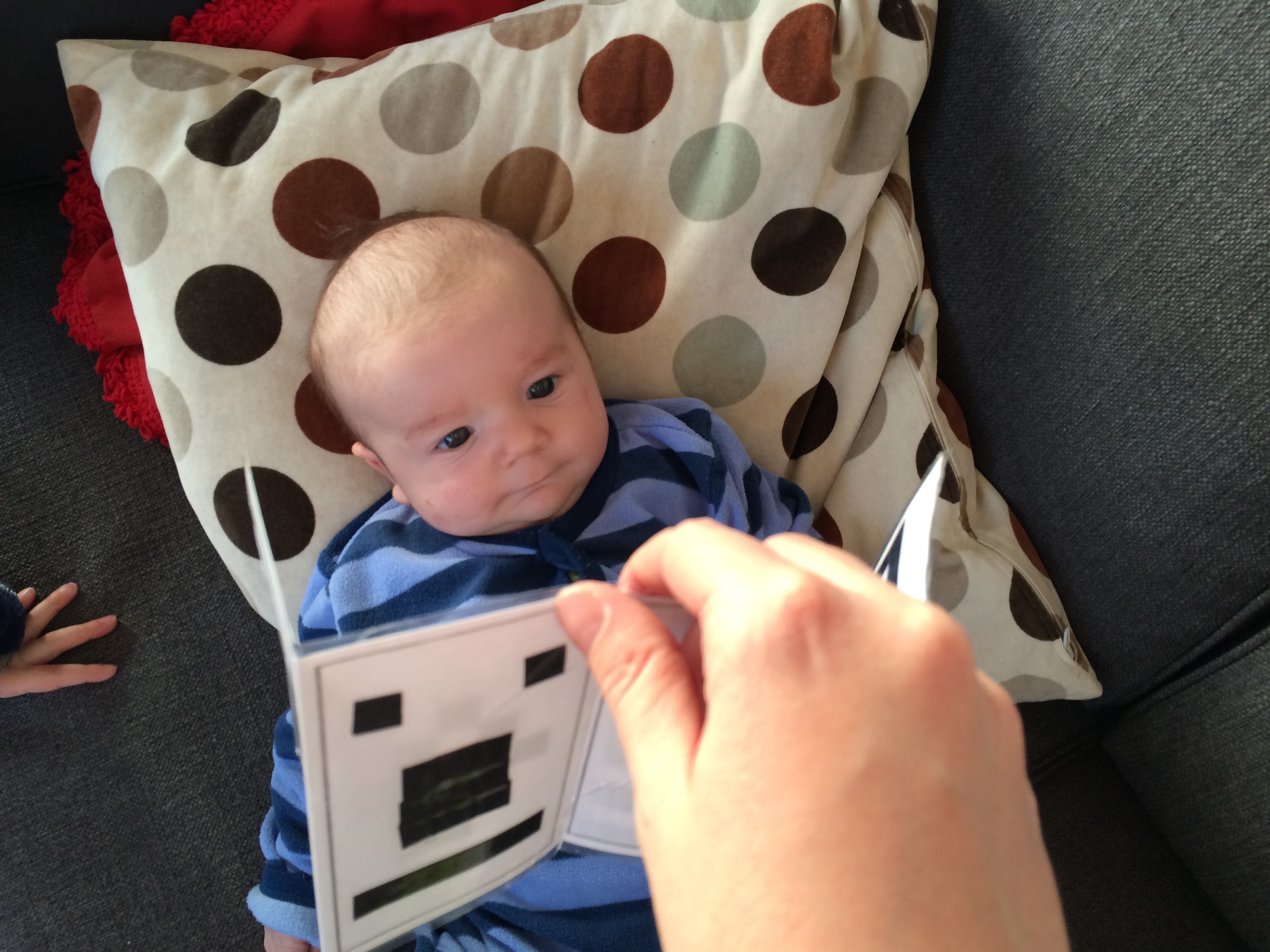 Van nekünk egy babajátékunk, amit még anno Balázs kapott, amiben egyik oldalán fekete-fehér minta van. Bendit ez nagyon leköti, ha meglátja van hogy mosolyog is.