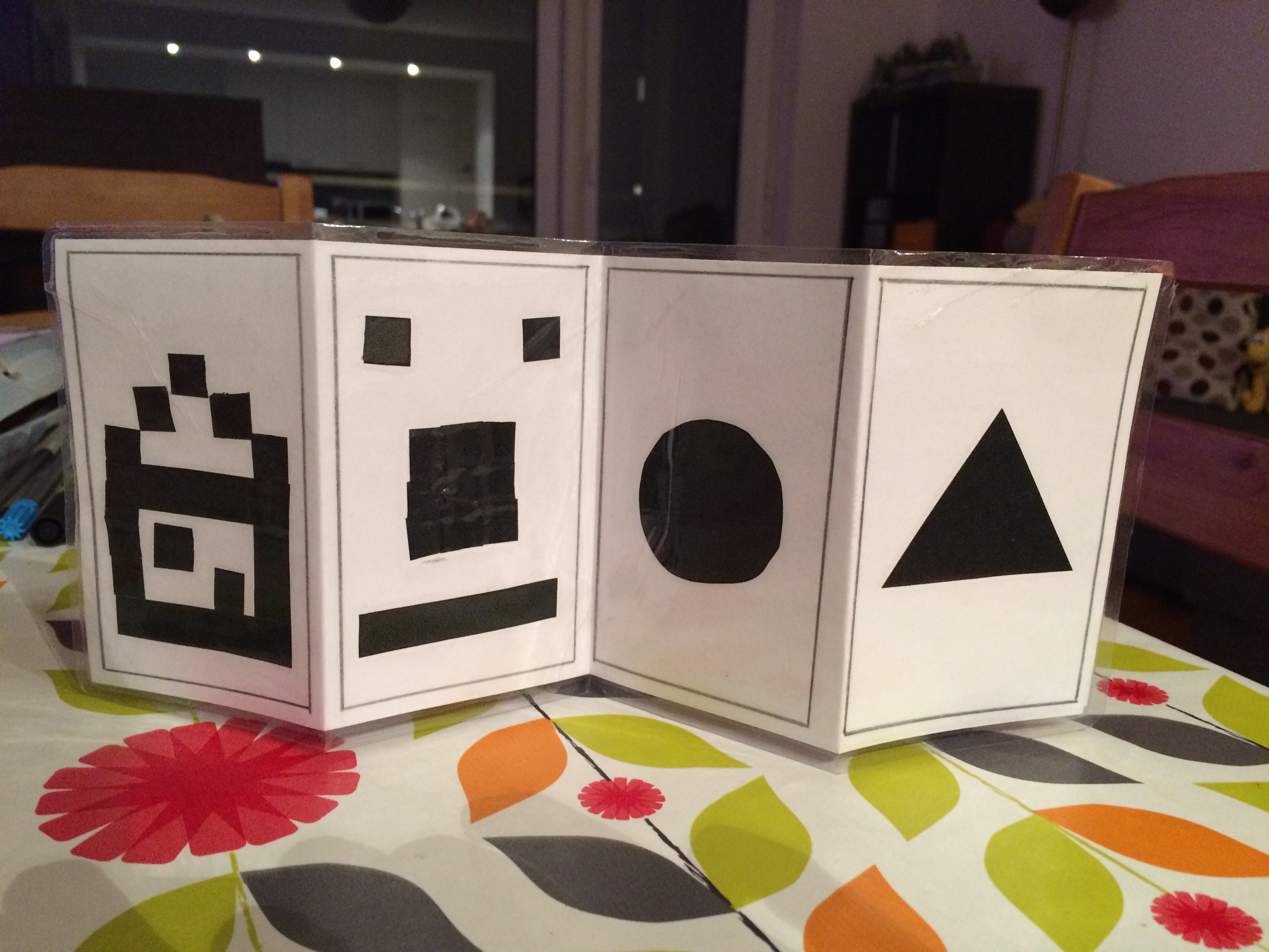 Egy A4-es papírt hosszában félbehajtottam, 4 részre osztottam, egy fekete öntapadós fóliát felvagdostam és ráragasztottam vele különböző egyszerű mintákat. (Ezt persze filctollal vagy ceruzával is rajzolhattam volna.) Mikor kész lett mindkét oldal, átlátszó öntapadós fóliával leragasztottam, hogy tartósabb legyen.