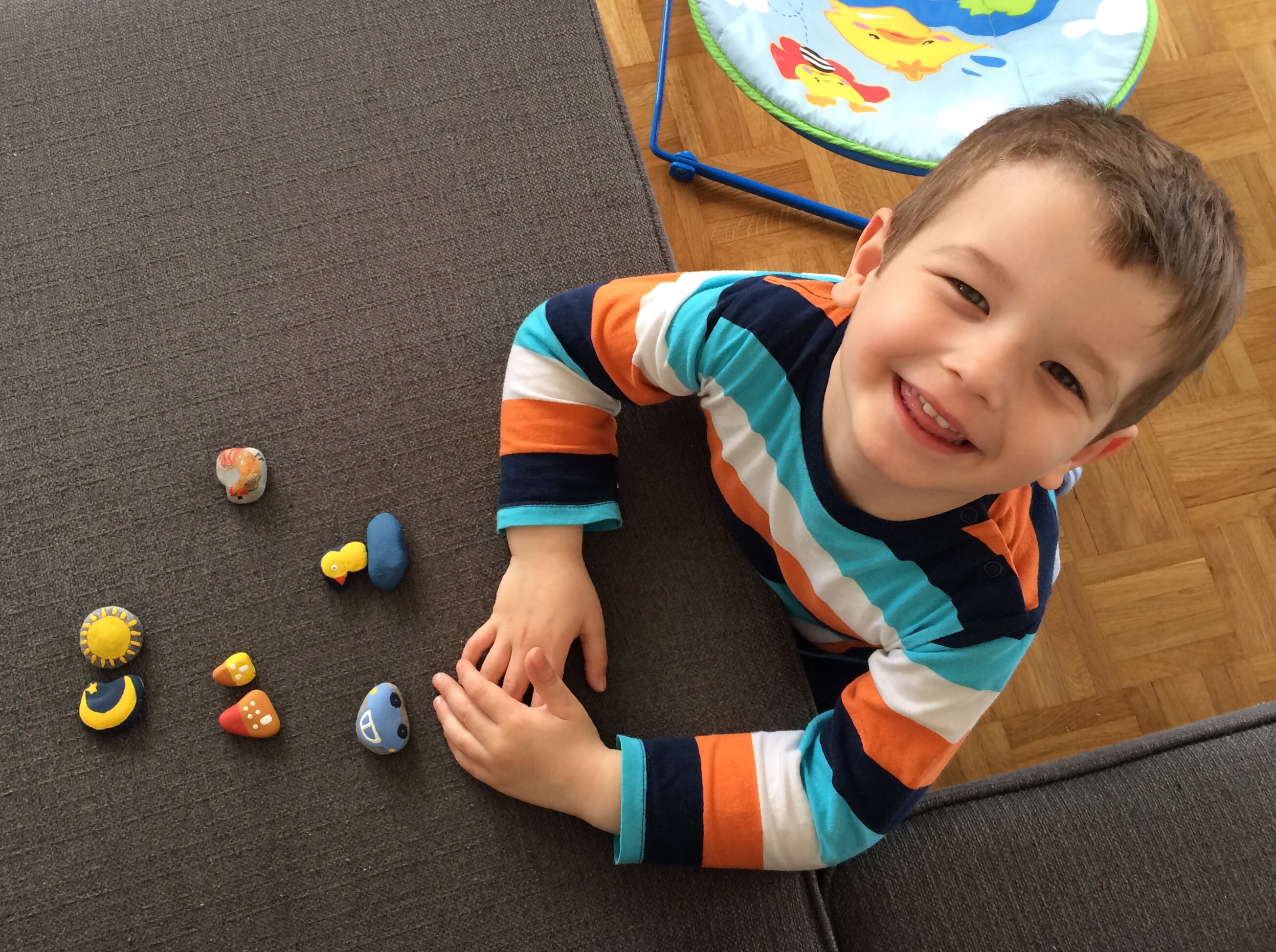 Balázs már elég nagy lett a társasokhoz, szívesen megold feladatokat, úgyhogy arra gondoltam, készíthetnénk ‘okos’ játékokat is kavicsból.