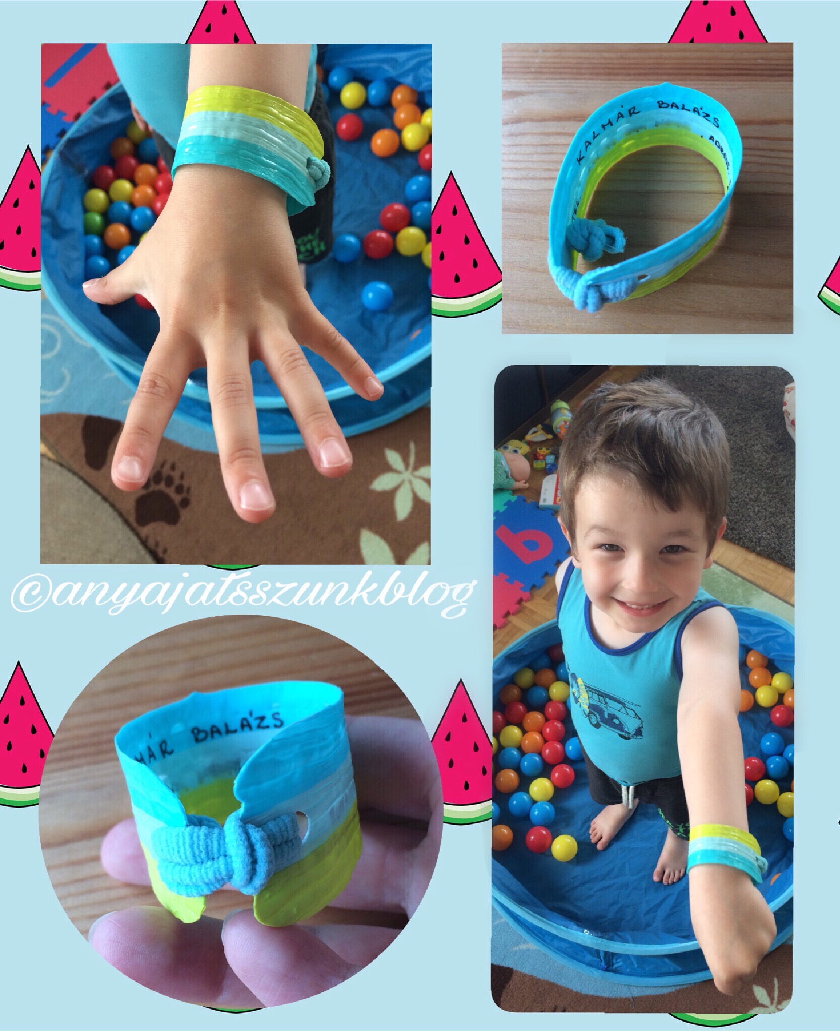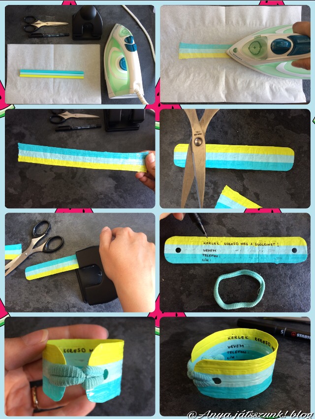 Egy videóban láttam az ötletet, hogy szívószálból karkötőt készítenek. Egyszerűen egy félbehajtott zsírpapír közé teszik a szívószálat és rávasalnak. Nos kipróbáltam, tényleg működik, sőt újítottam is az ötleten. Az jutott eszembe, hogy ez egy kitűnő anyag, mivel nem szakad, erős műanyag, nem ázik el, vagyis akár a strandon is használható. Könnyen megköthetjük egy gumival (én egy hajgumit használtam), így könnyen le és feltehetjük a kicsi karjára.