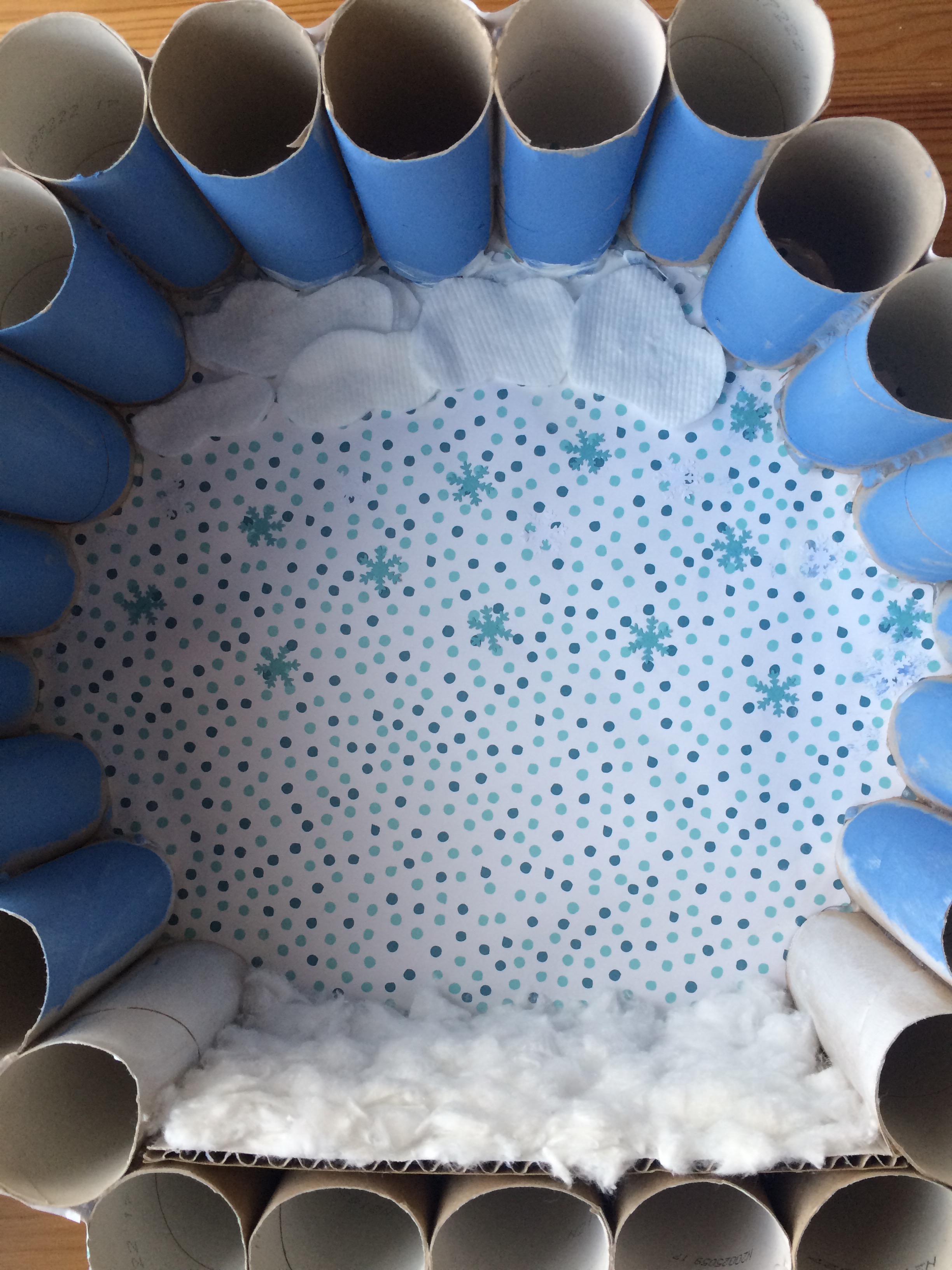 A kis polcra vattát tettem, hogy olyan legyen mint a hó, a háttérre is ragasztottam ‘felhőket’ vattakorongokból és hópelyheket.