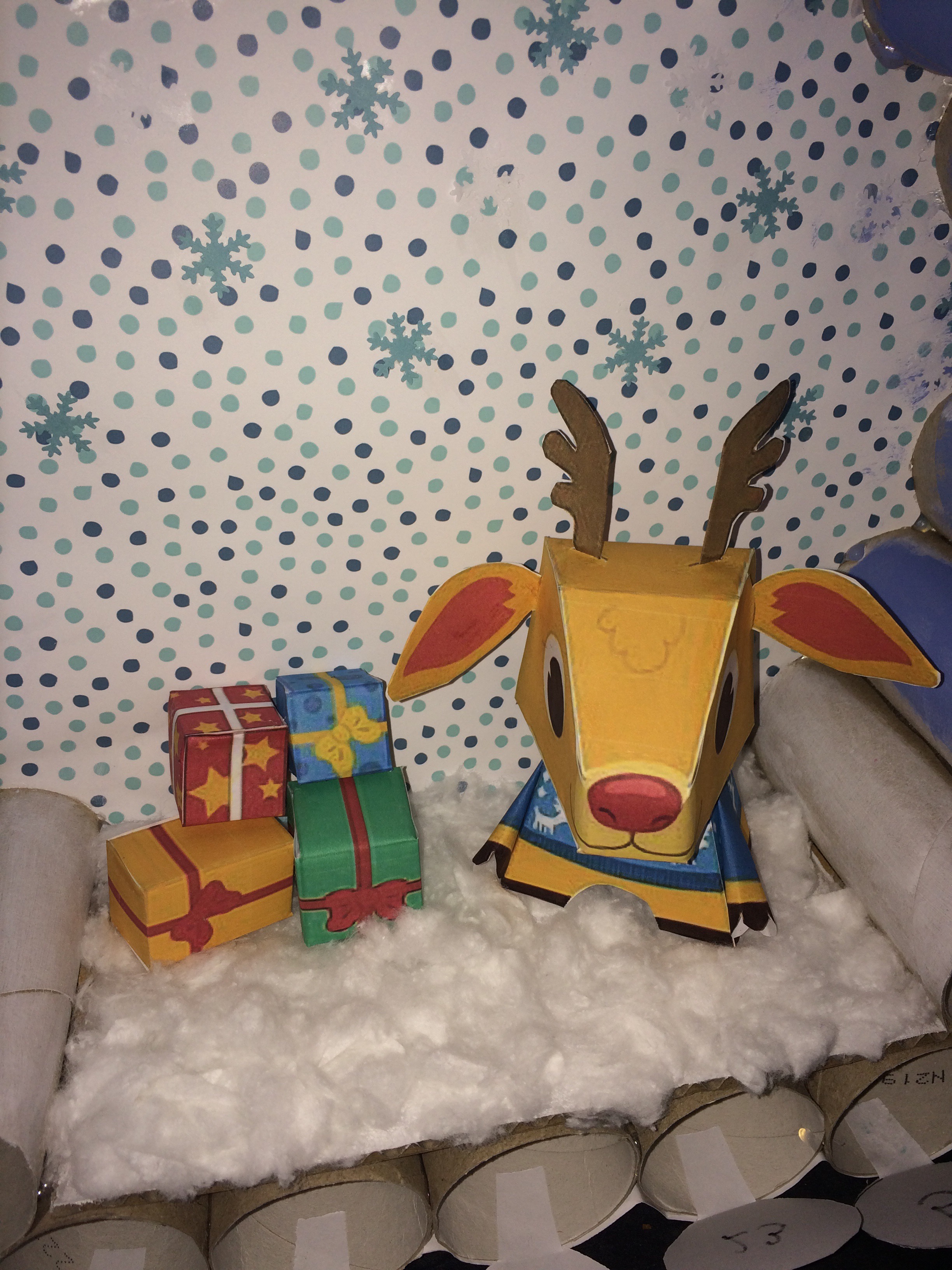 Középre a ‘hóba’ egy régebben talált papír rénszarvas ötlet jutott eszembe. Itt (https://pin.it/dr55xtcqx5bjau) kinyomtatható hozzá a sablon. A kis ajándékokat is innen nyomtattam, majd ragasztottam.