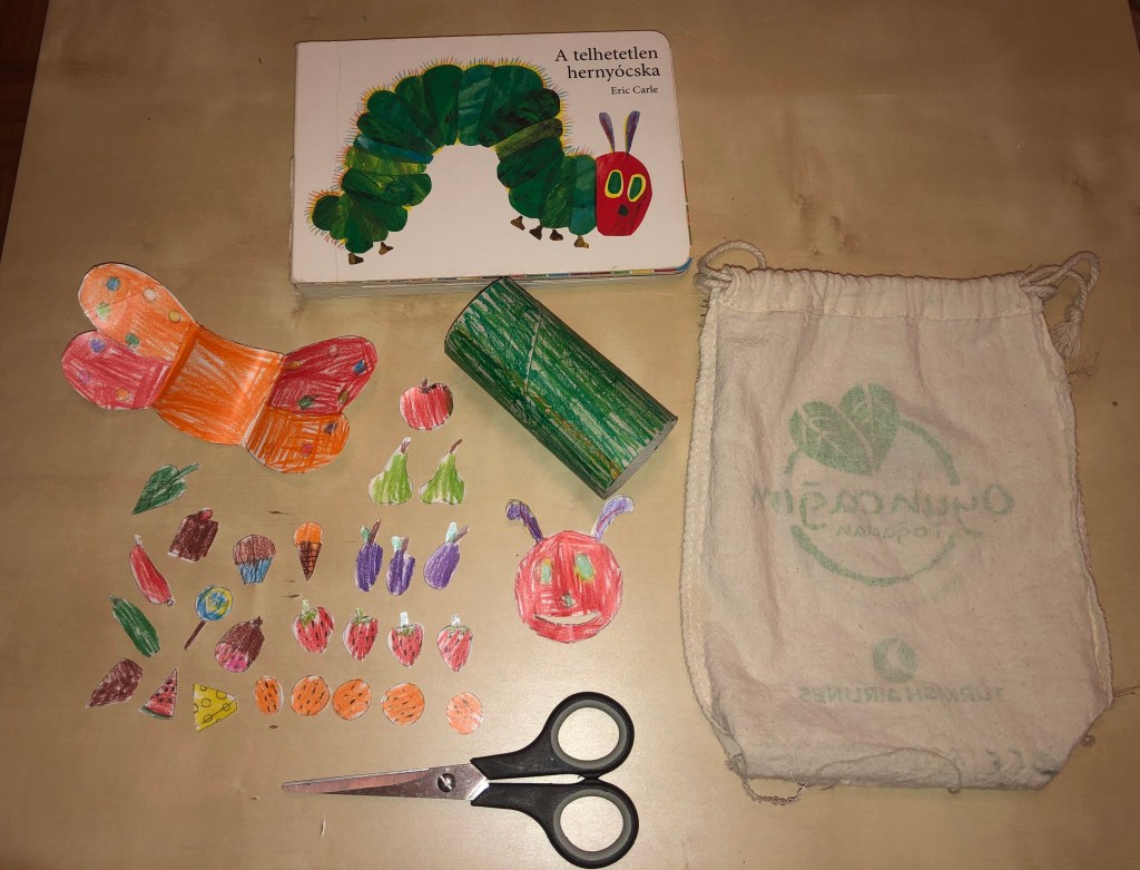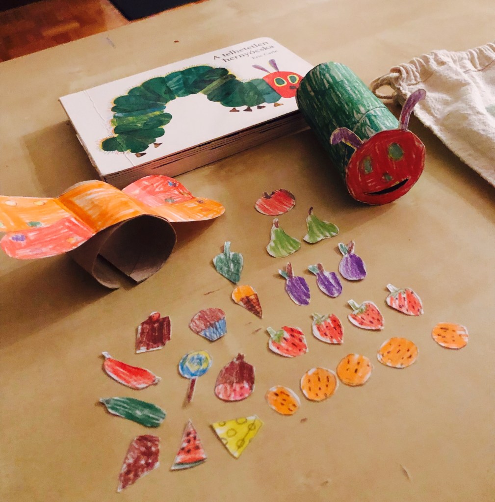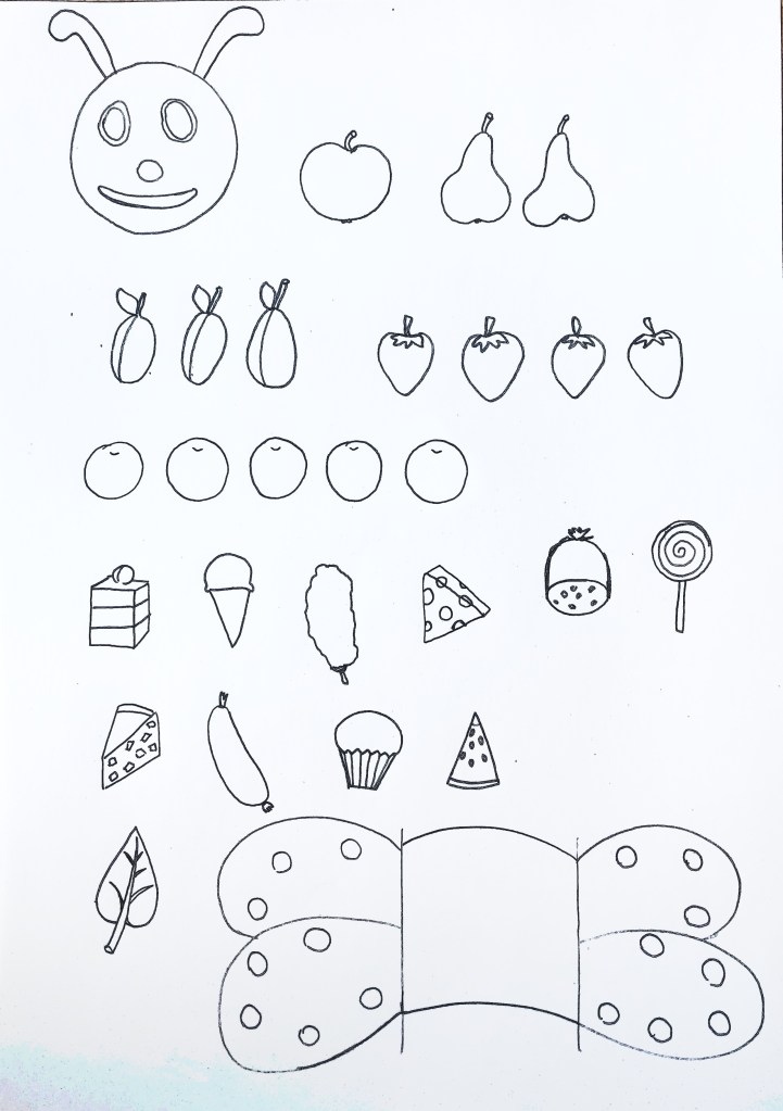 1. Rajzoljunk hernyó fejet (akkorát amekkora a papírguriga átmérője) , rajzoljuk le a gyümölcsöket és mindent amit megeszik (akkorák legyenek, hogy a száján beférjenek majd!) és rajzoljunk pillangószárnyat (méretezzük a papírgurigához)