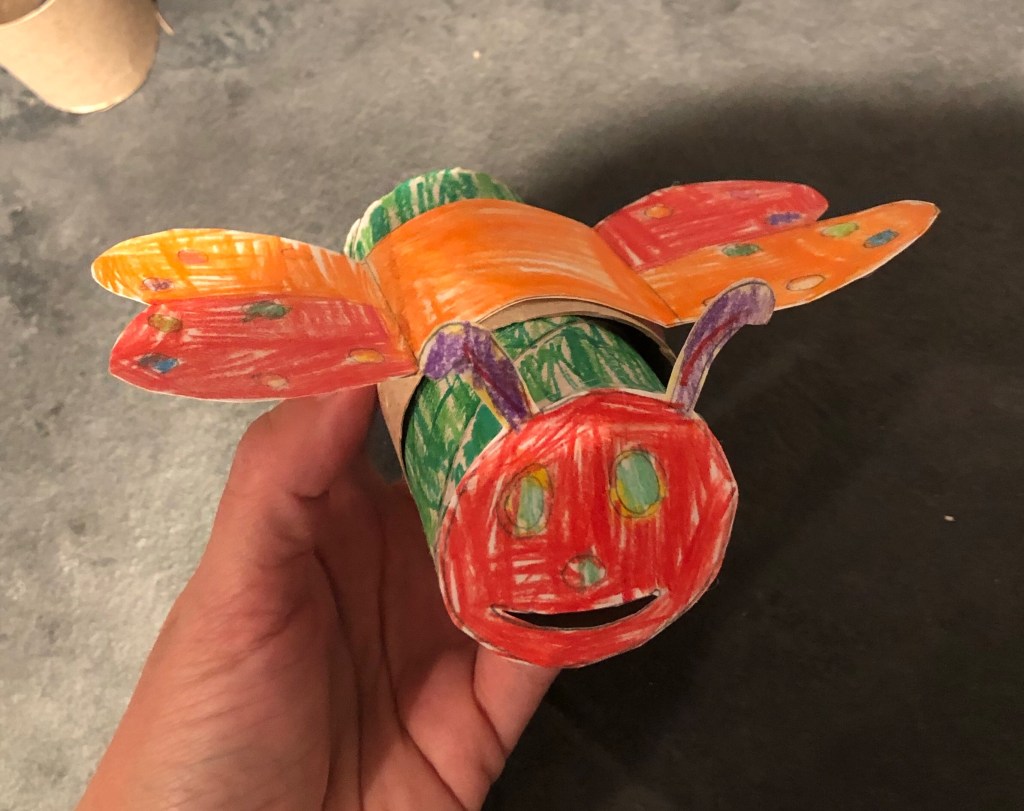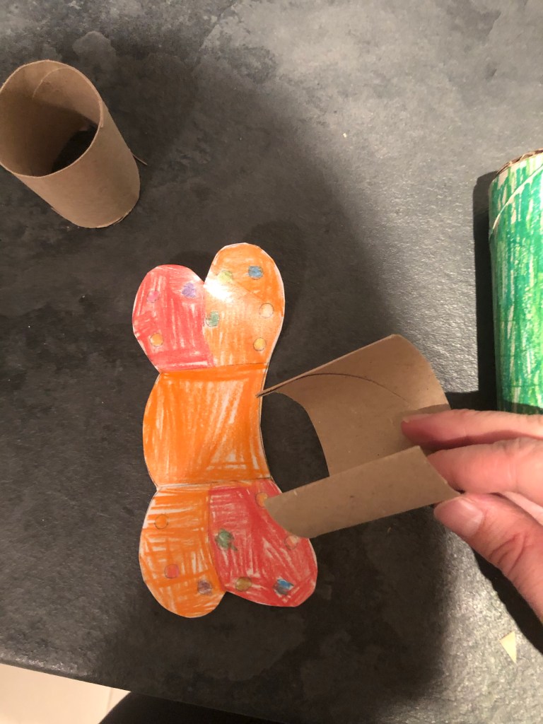 6. A pillangószárnyhoz a másik papírgurígát félbevágtam és egyik oldalon hosszában megnyitottam. Ráragasztottam a szárnyat, így le és fel lehet tenni újra és újra a hernyóra.