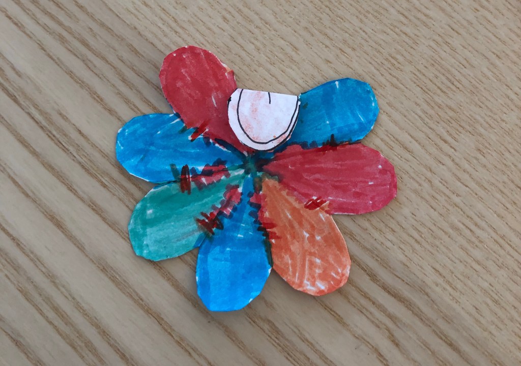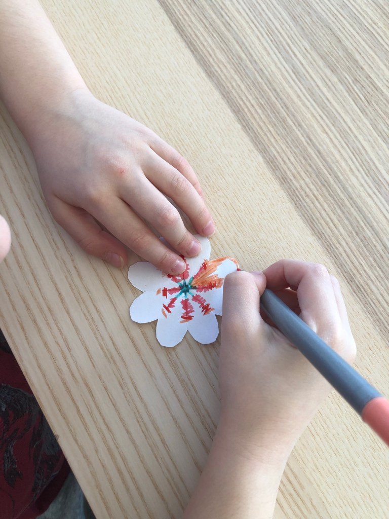 2. Az egyik oldalát kiszíneztük, a másik oldalára fekete filccel a szírmokat megrajzoltuk