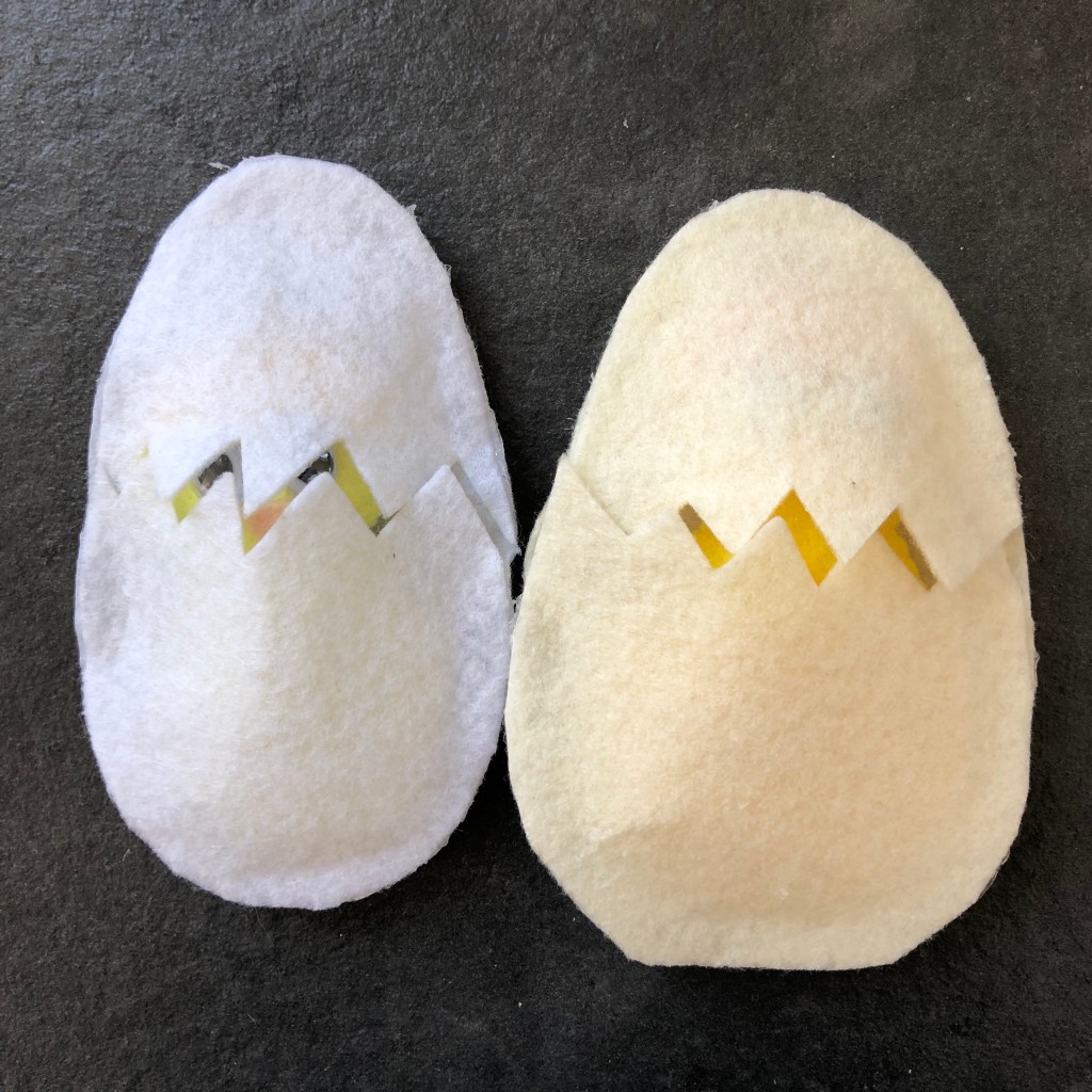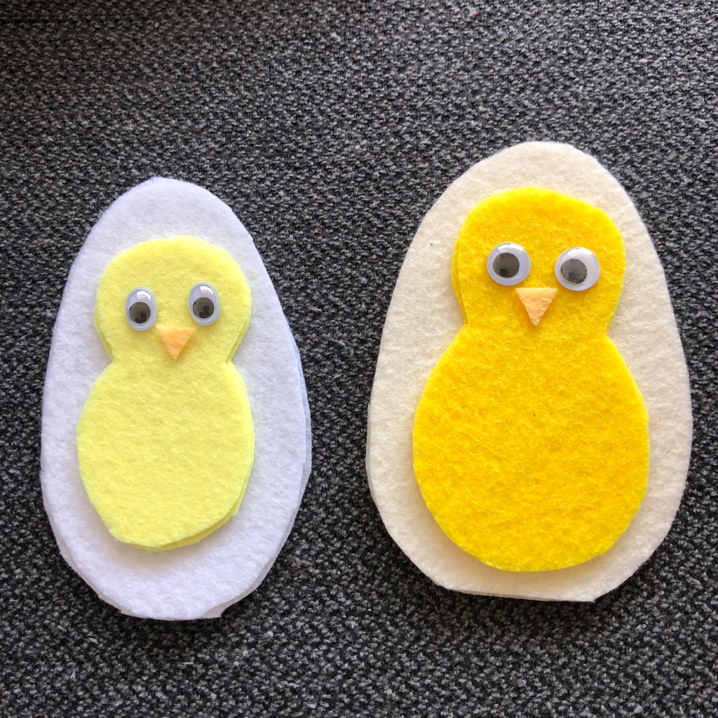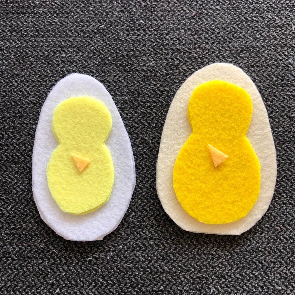 Filc anyagot használtam hozzá. Egyszerűen kivágtam sárga filcből 4 csibe alakot, 4 tojást és két kis háromszöget a csőrökhöz.