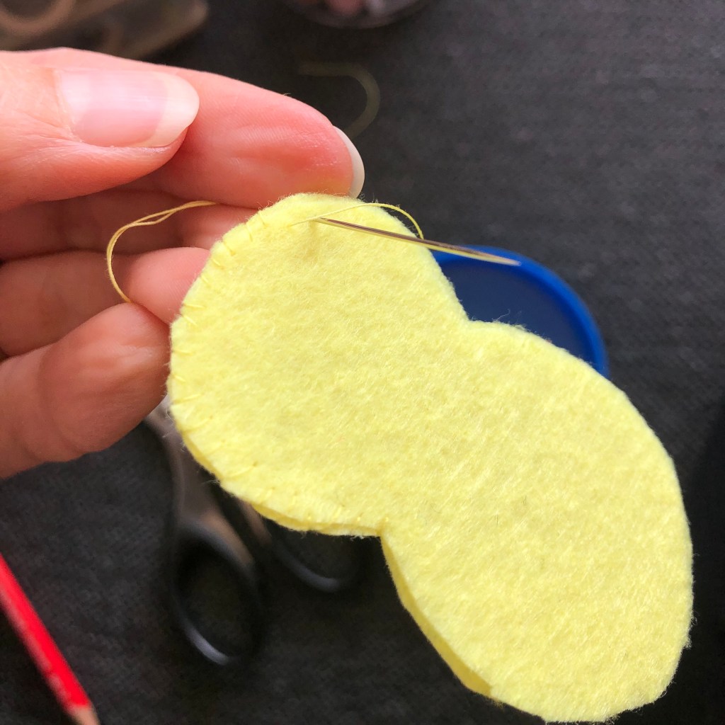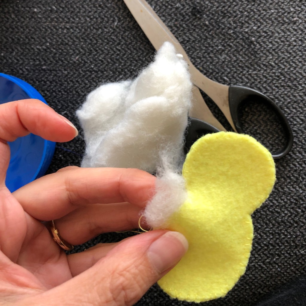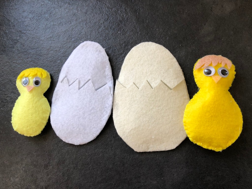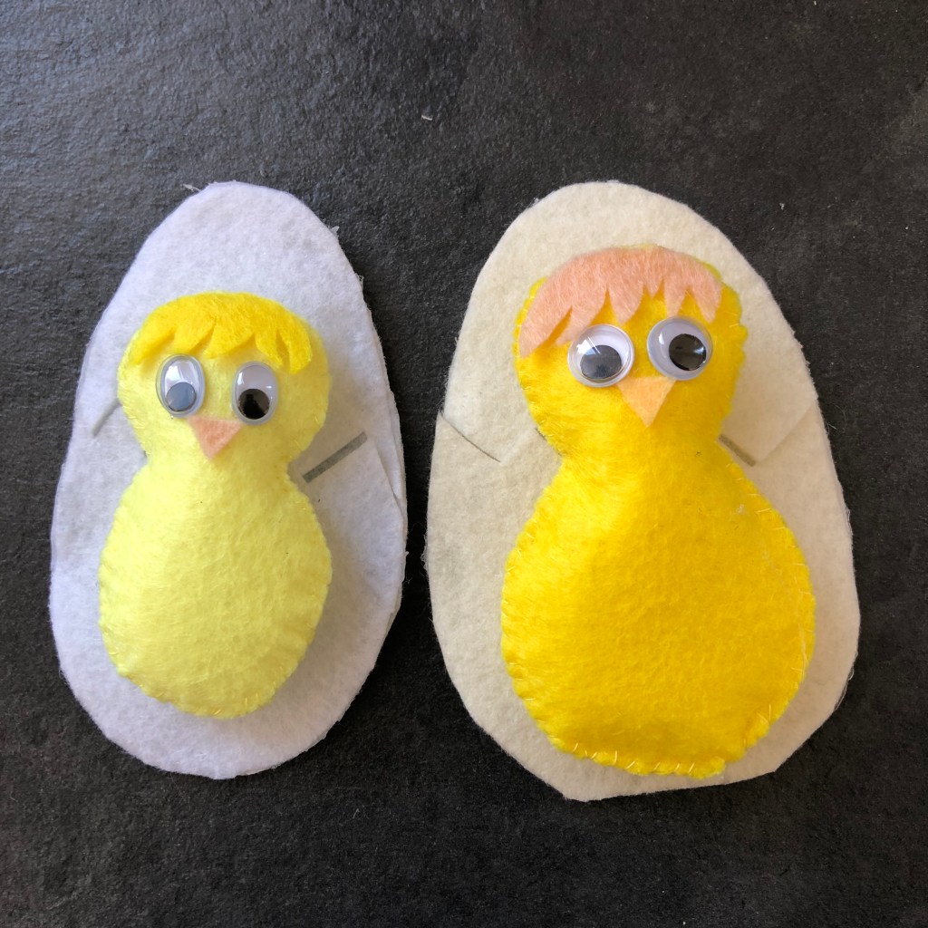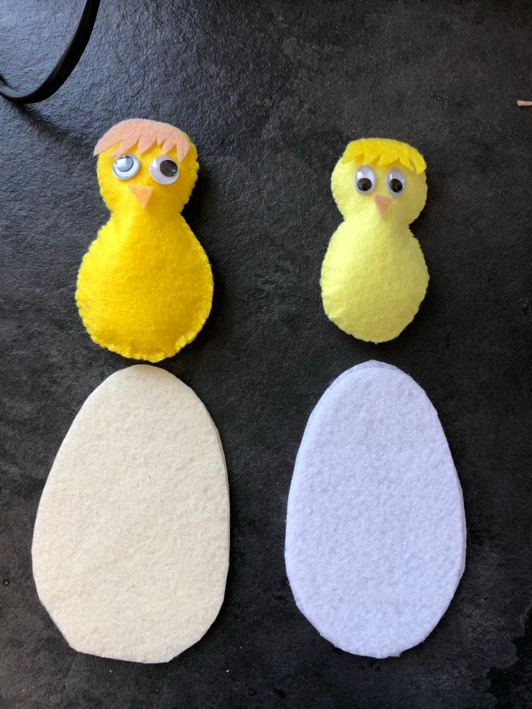 Két két csibe formát körbeöltöttem cérnával, majd tömőanyaggal kicsit kitömtem. Ragasztópisztollyal ráragasztottam két két szemet és a csőröket, és utólag egy-egy hajat is kivágtam filcből, és ráragasztottam a kis fejükre :).