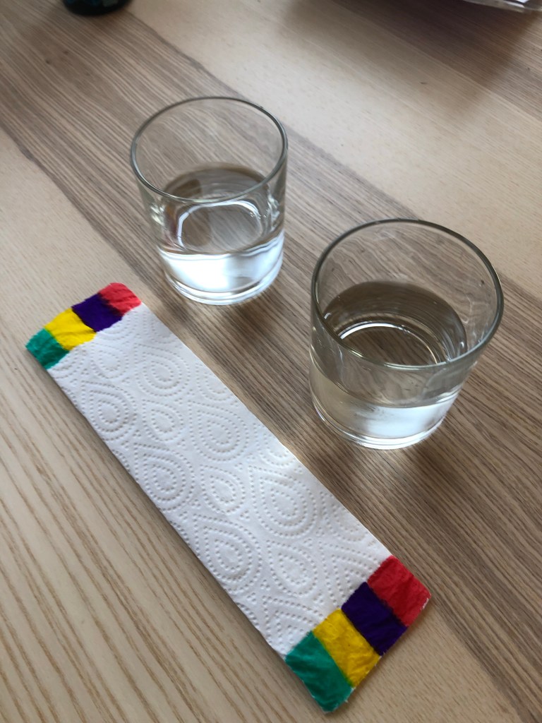 Egy csíkot levágtunk a konyhai papírtörlőből, a két végét filctollal kiszíneztük és két pohár vízbe tettük ezt a két csíkokban különböző színekre színezett végét. Ahogy a vizet felissza a papír, a színek úgy kúsztak fel szépen lassan a papíron, majd középen összeérnek. 🌈