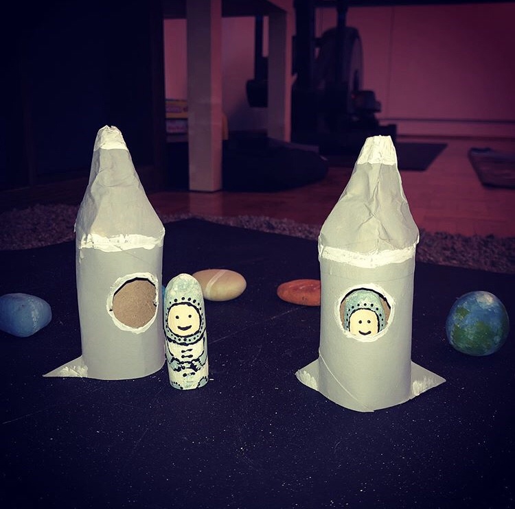 Papírgurigából és tojástartóból kivágott kúpból űrhajót készítettem (2-t, hogy mindkét fiúnak legyen) kifestettem, vágtam rá ablakot is, hogy a két kis űrhajós ki tudjon kukucskálni;). Az asztronautákat egy-egy darab uszadék fából készítettem nekik. Ezt is a tóparton szedtem a kavicsokkal együtt. Akril festéket használtam, mindenhez.