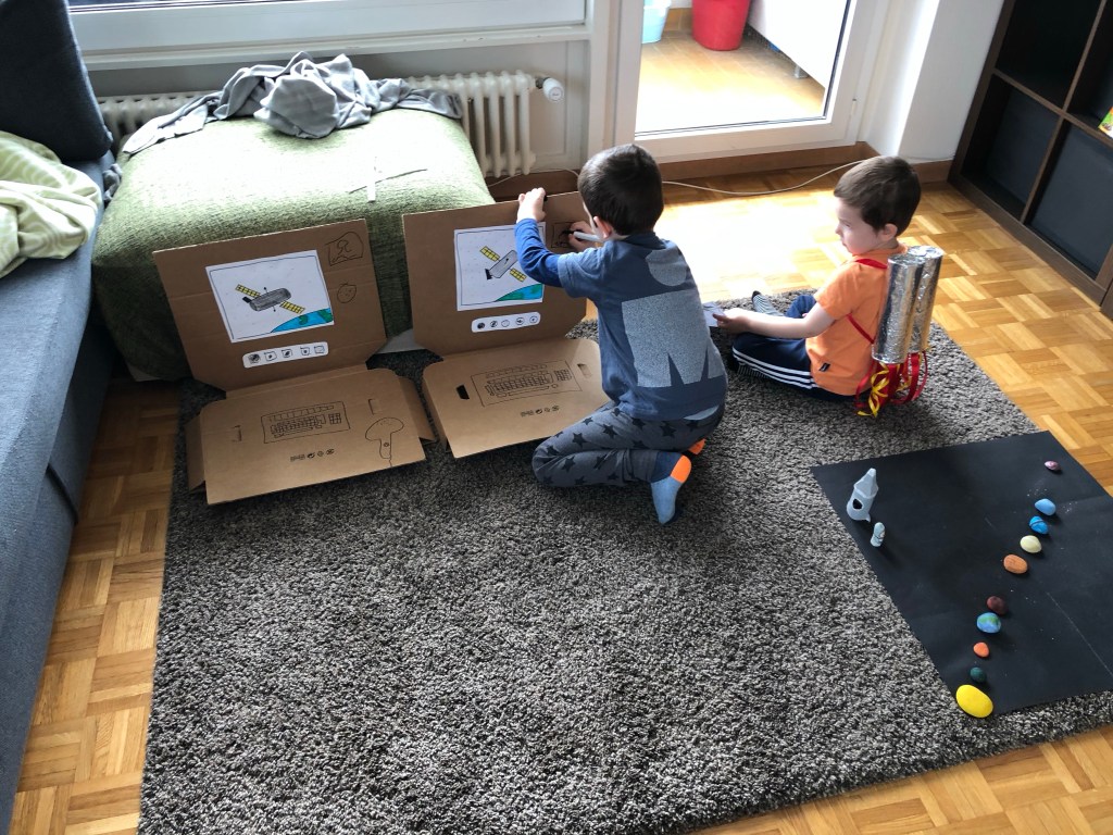 Ahhoz, hogy el tudjuk játszani, Bebe lett az űrhajós, elővettük a régi jelmezét és egy nagy doboz lett az űrhajó. (Erről is van korábbi cikk, itt találjátok: https://anyajatsszunk.com/2019/10/24/halloween-jelmez-ket-gyerekre-naprendszer-es-urhajos/ )
