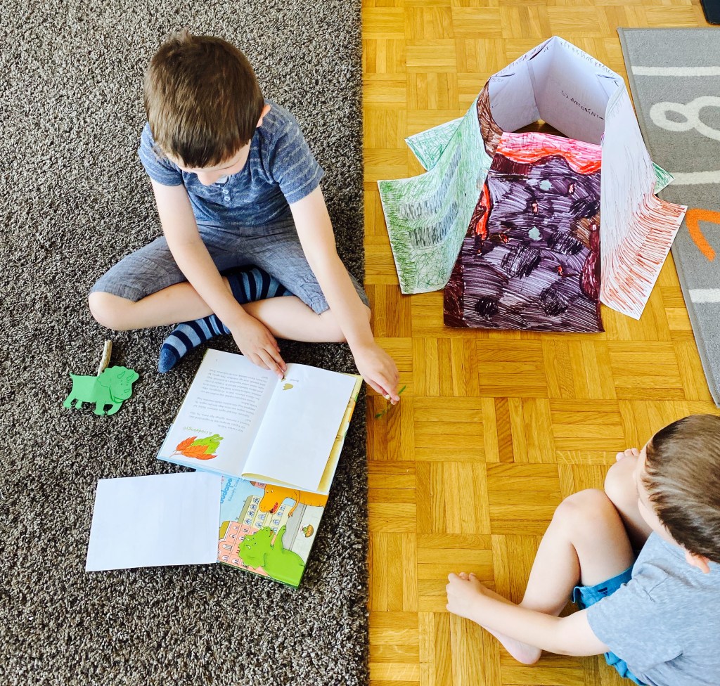 Bali kitalálta, hogy készítsük el az öt kötetben külön-külön megjelenő vulkánokat úgy mintha egy nagy vulkán lenne, és ő miközben felolvassa a mesét, el is játssza nekünk.