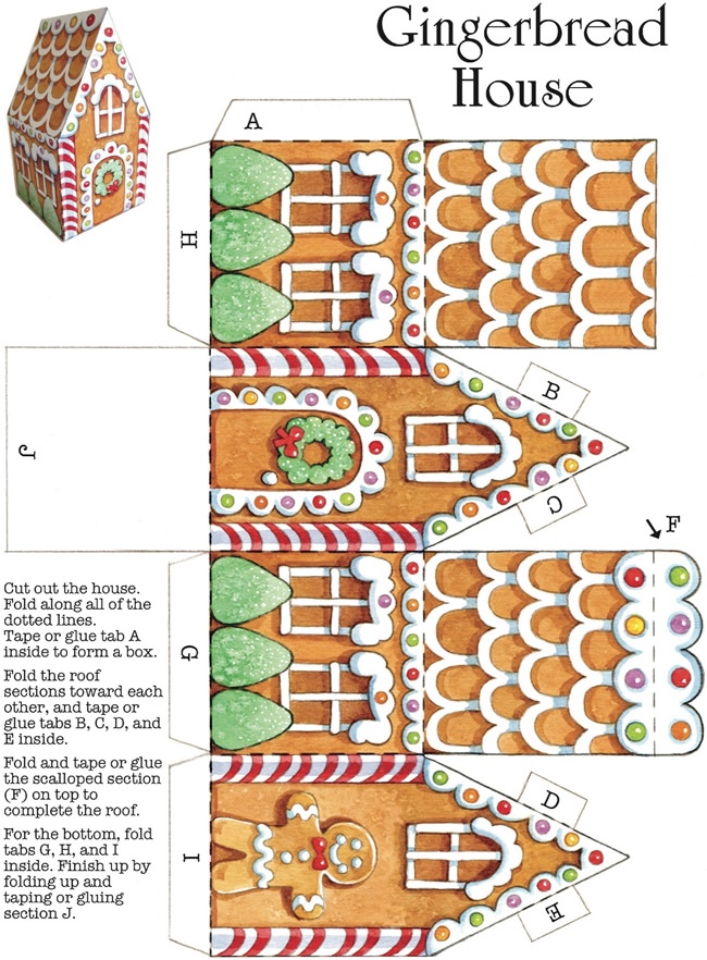 Készítsétek el ezt a mézeskalács házat! Ki kell nyomtatni, körbevágni és a betűvel jelölt részeknél összeragasztani.
