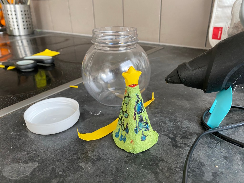 Az üveg tetejét (vagyis így már a hógömb alját) leragasztottam körben, így jobban is néz ki és kisebb az esélye, hogy a srácok kinyissák 😅🤞🏻. /mert akkor jöhet a takarítás..ezt a hungarocellt meg nehéz összeszedni/