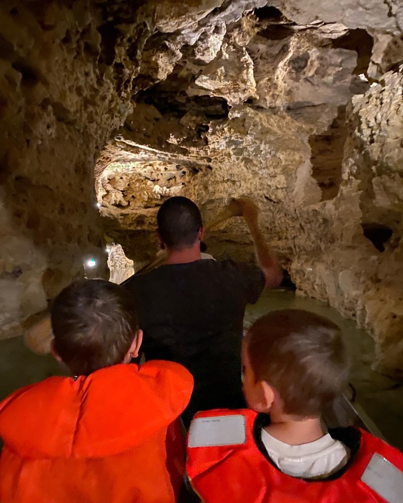 A beengedés után a csoport vezetője egy előadás kíséretében körbevezet a kiállításon, sokmindent megtudtunk a barlangokról, cseppkövekről, milyen föld alatti barlangrendszer húzódik itt Tapolca alatt. Majd egy kisfilmet is végignézhettünk róla. Ezután következett az igazán izgalmas rész, lementünk egy hosszú lépcsősoron a barlangba, csodálatos hely, kisebb séta után a föld alatti tó partján beültünk mi is a saját kis csónakunkba. Nálunk Apa evezett majd a két fiú ült középen (mentőmellényt kaptak felszállás előtt) én pedig hátul zártam a sort:).