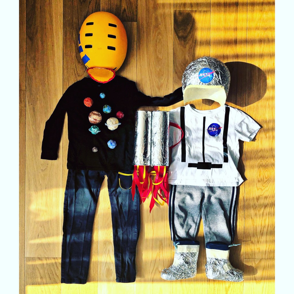 Akkoriban épp az űr téma ment nagyon nálunk. Űrhajózás, naprendszer, rengeteget olvastunk az űrről. Nem volt kérdés, hogy ezt válasszuk jelmeznek. Imádták:)