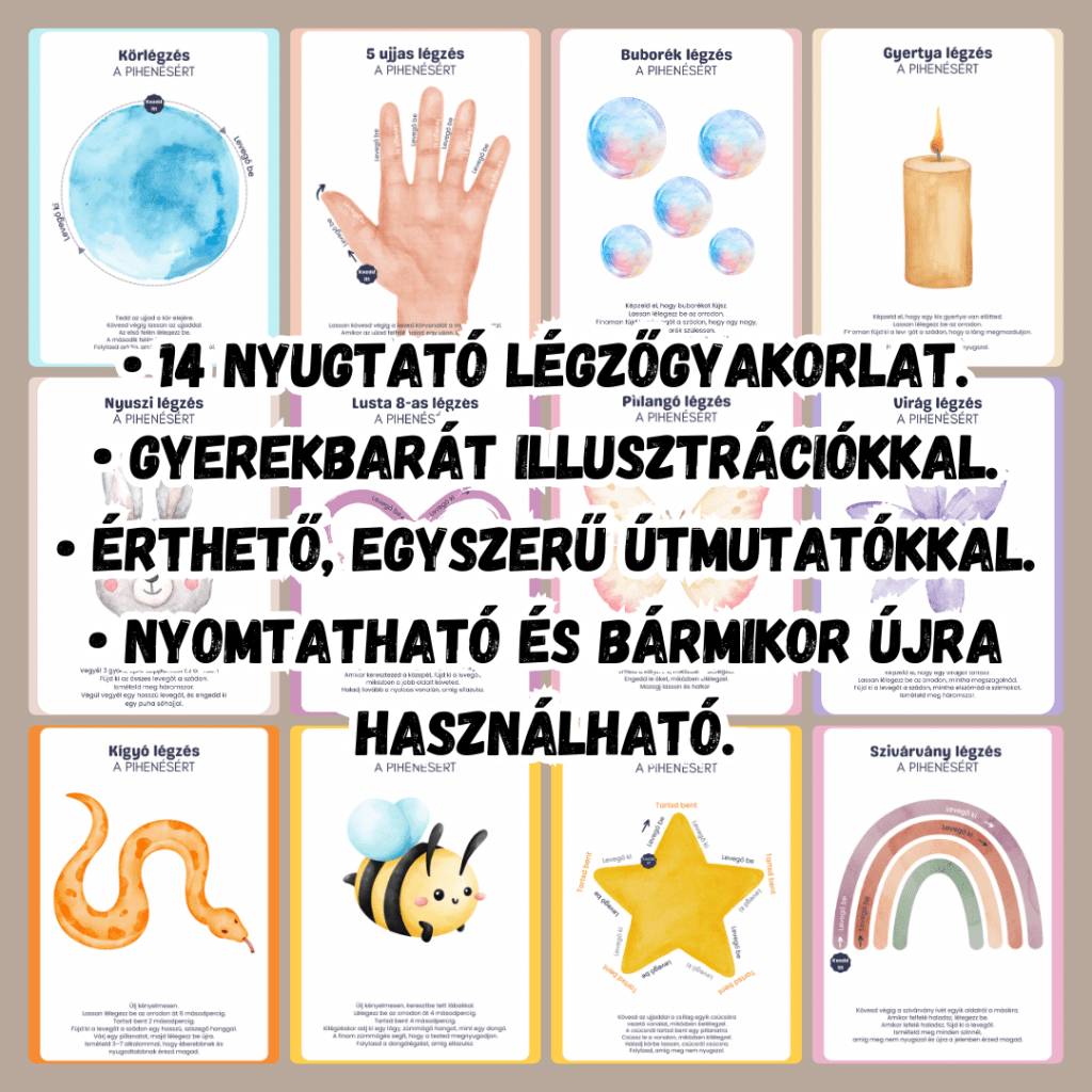 - 14 légzőgyakorlatot kedves, gyerekbarát illusztrációkkal